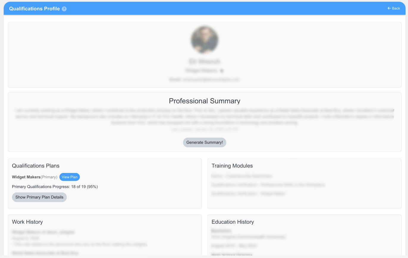 A unified qualifications profile that brings together training progress, experience, and education to generate a professional summary aligned to a user’s role.